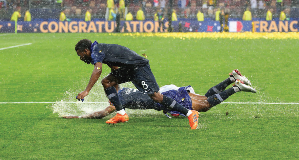 Газон в Лужниках с успехом выдержал не только интенсивное расписание футбольных матчей чемпионата мира, но и натиск непогоды. На снимке футболисты сборной Франции испытывают газон "на прочность" после победы в финале первенства.