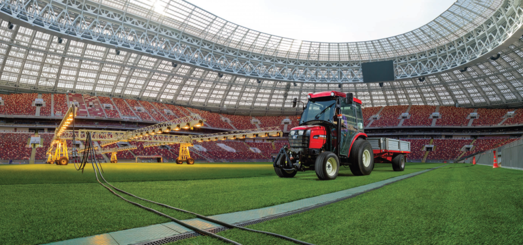 Стадион "Лужники" г. Москва. Трактор Shibaura ST333 HST с грузовым прицепом Ravenna RT250.